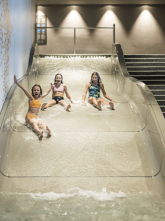 Wer meistert die Rutschpartie am allerschnellsten? Das verrät der Zeitmesser unserer Speed-Wasserrutsche. Mit etwas weniger Geschwindigkeit, aber genauso viel Spaß saust ihr über die Erlebnis-Reifenrutsche und die Wellenrutsche.